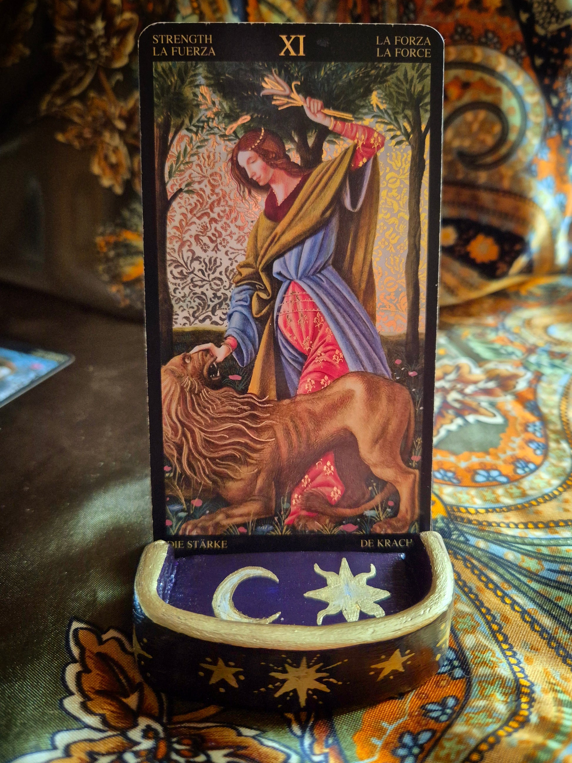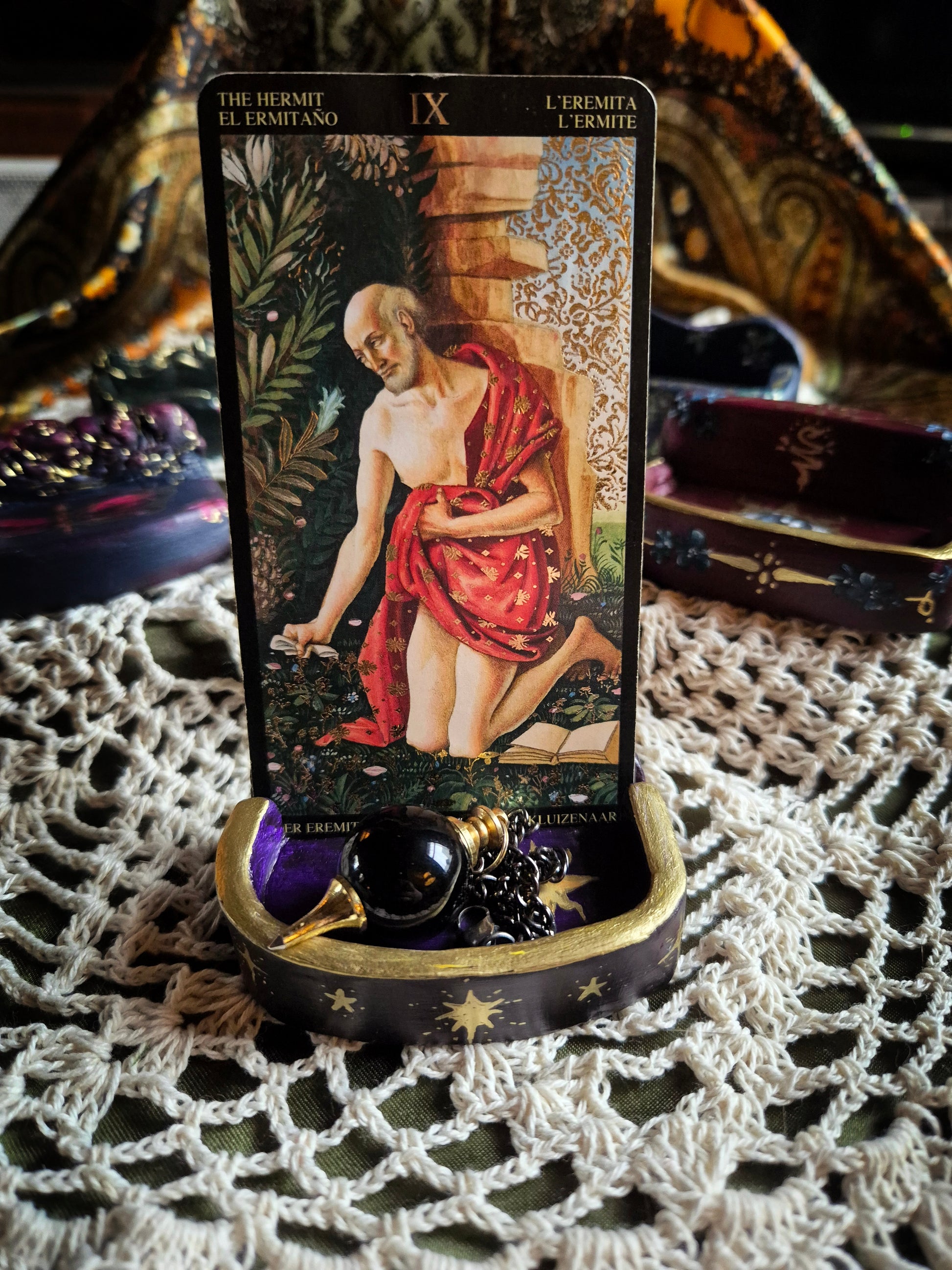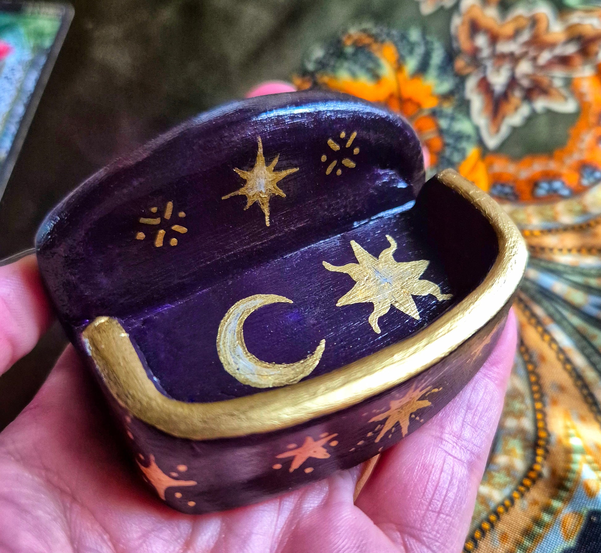 Give your tarot or oracle card a place of honor with this hand-painted Arcana Altar. Each piece is unique and has a special spot for a crystal, amulet, or other meaningful object. Perfect for amplifying your intentions and keeping your daily card in sight ♡