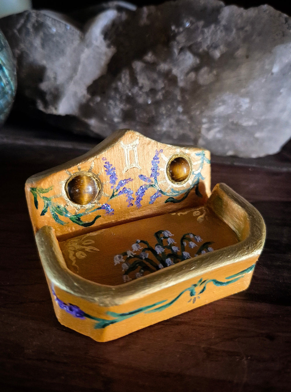 Give your tarot or oracle card a place of honor with this hand-painted Arcana Altar. Each piece is unique and has a special spot for a crystal, amulet, or other meaningful object. Perfect for amplifying your intentions and keeping your daily card in sight ♡
