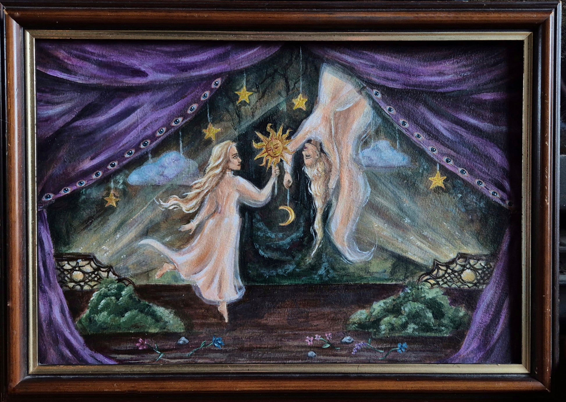 Like a lot of my art this painting also has its depictions of duality and mysticism.. of light and shadow, of creation held tenderly between two hands.