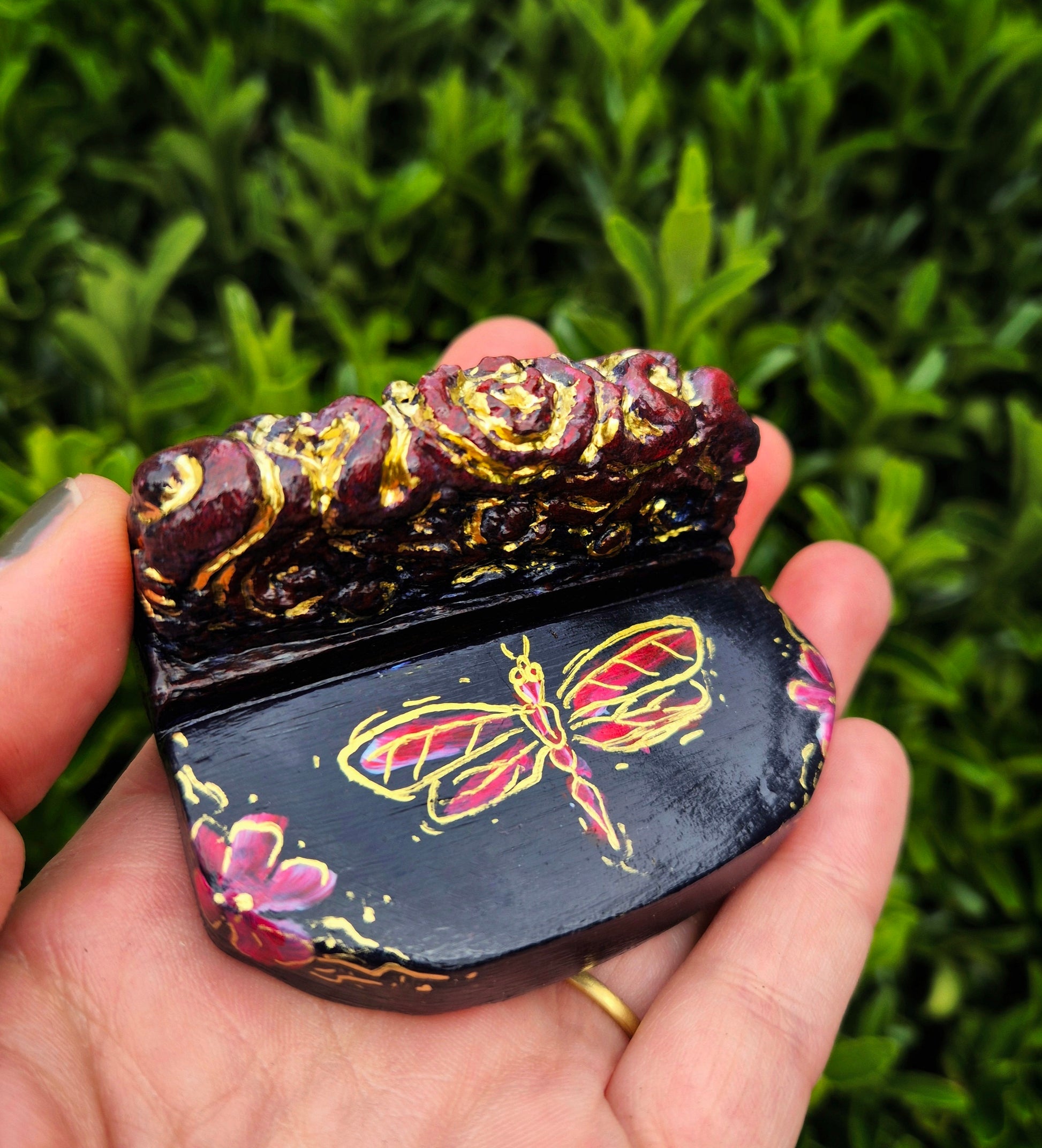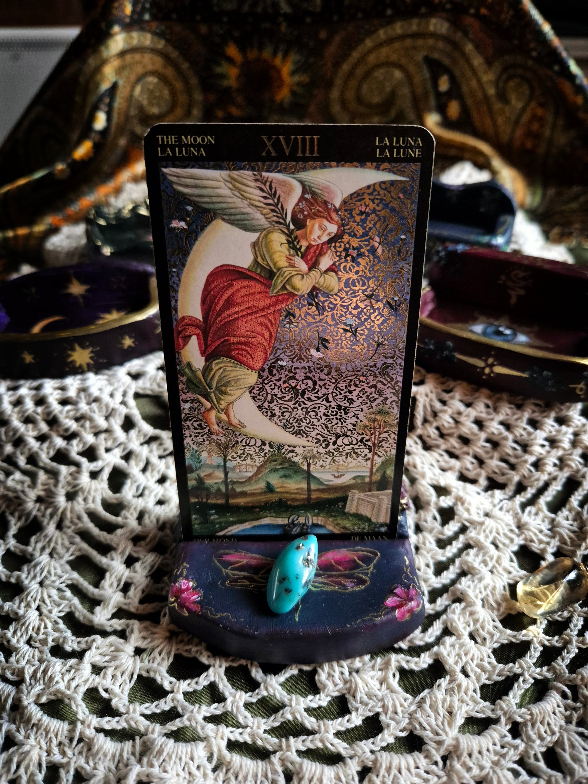 Give your tarot or oracle card a place of honor with this hand-painted Arcana Altar. Each piece is unique and has a special spot for a crystal, amulet, or other meaningful object. Perfect for amplifying your intentions and keeping your daily card in sight ♡