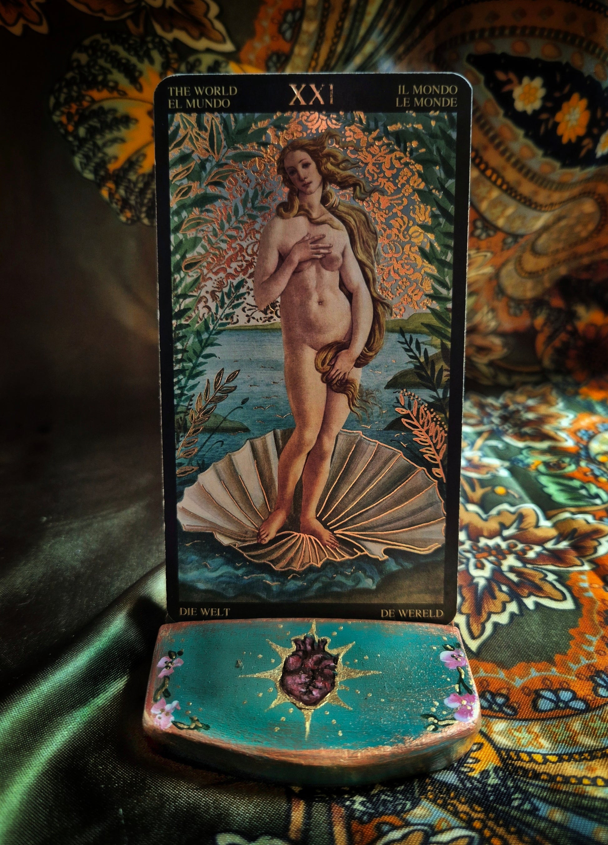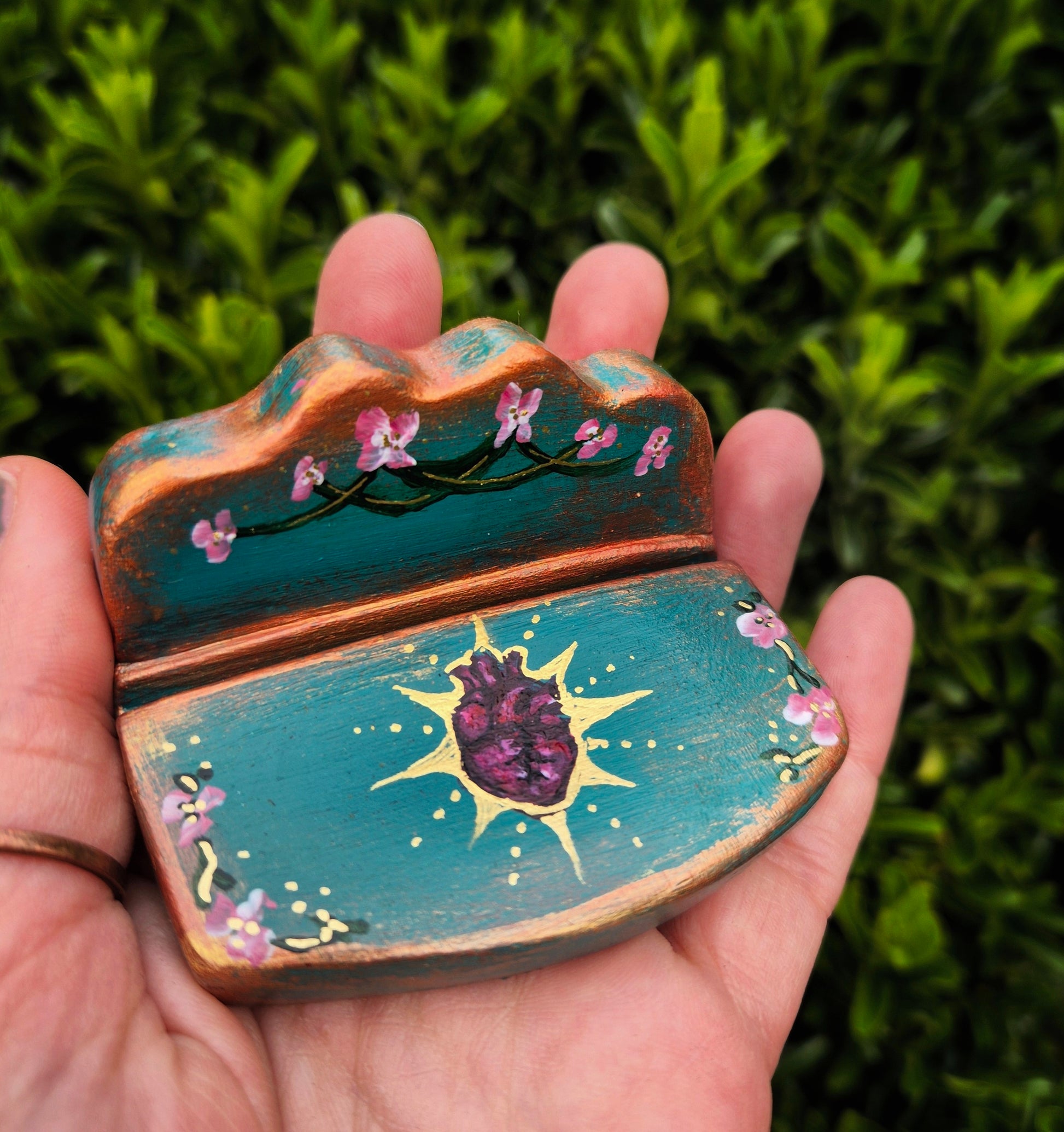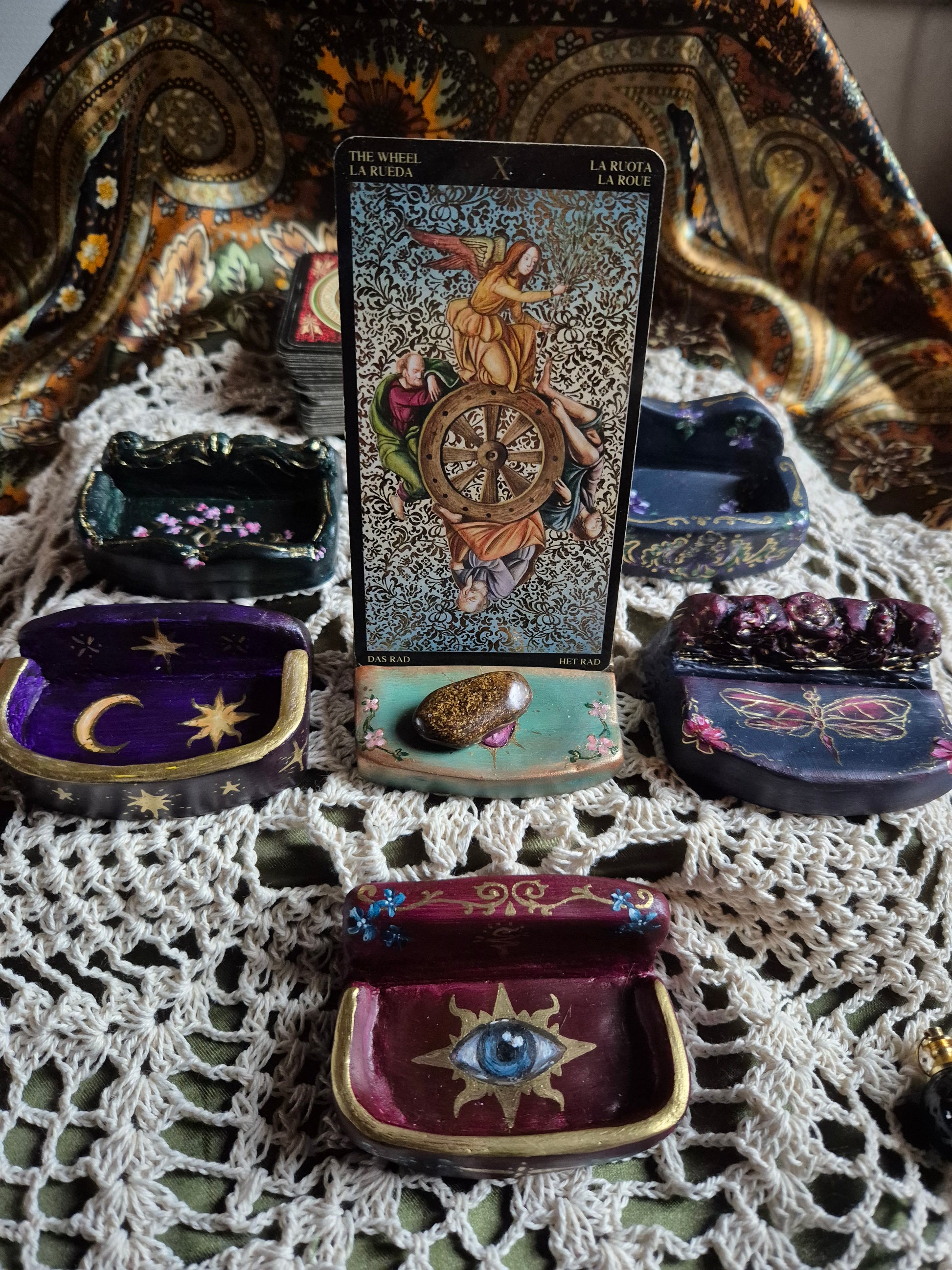 Give your tarot or oracle card a place of honor with this hand-painted Arcana Altar. Each piece is unique and has a special spot for a crystal, amulet, or other meaningful object. Perfect for amplifying your intentions and keeping your daily card in sight ♡