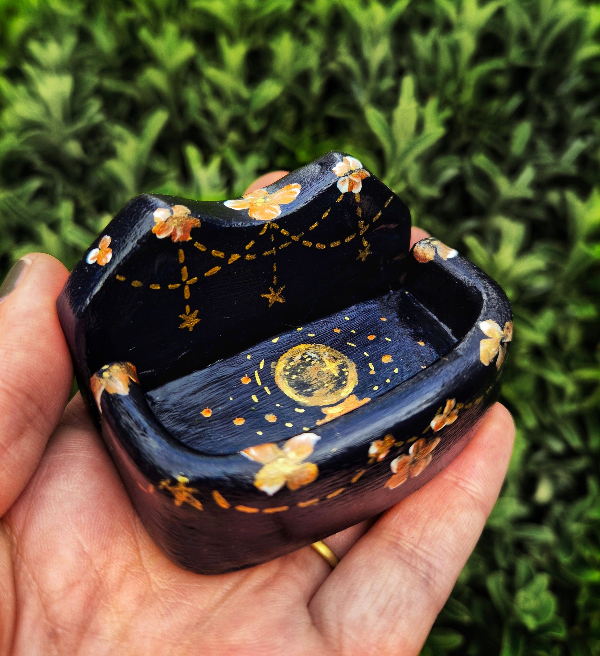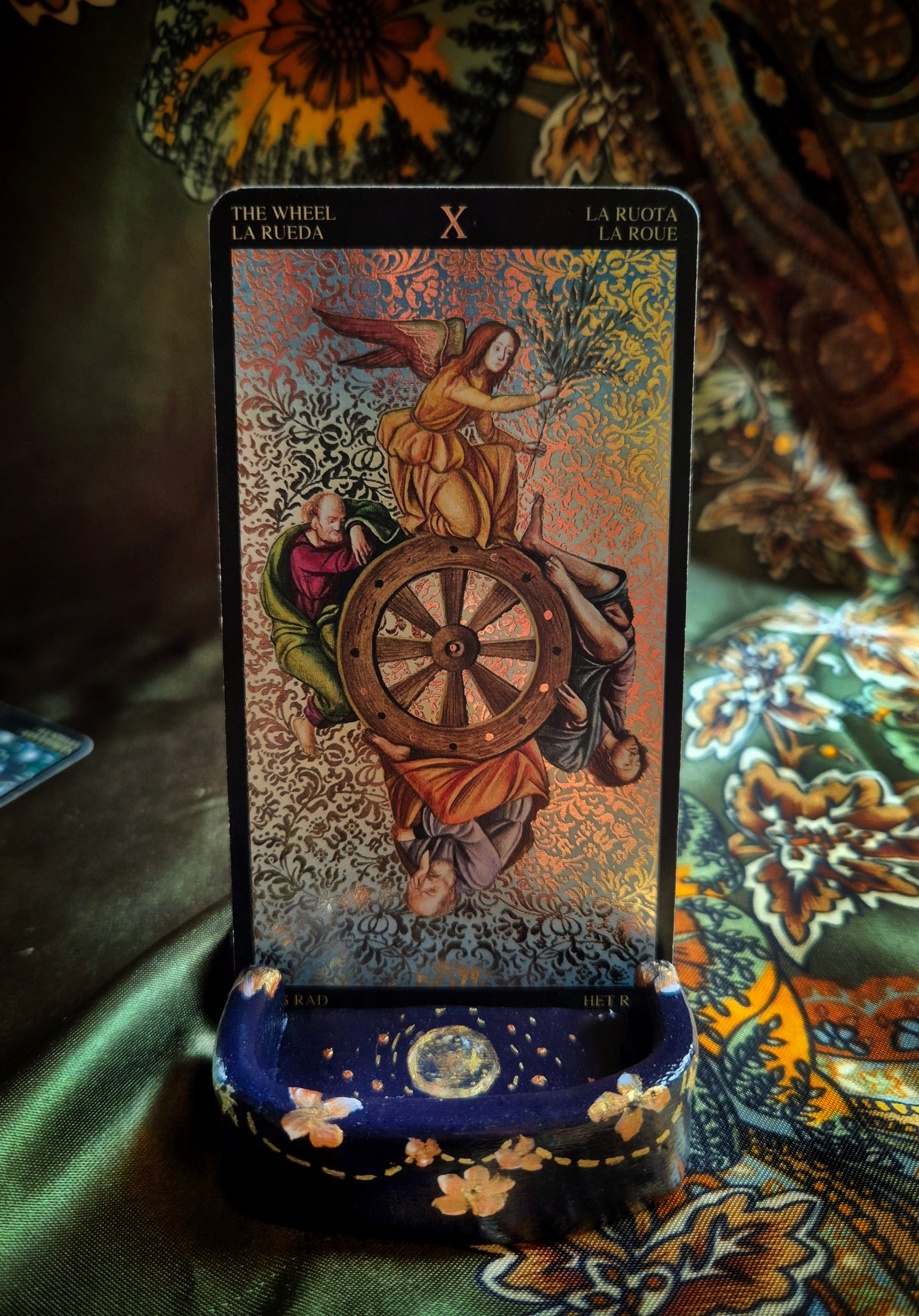 Give your tarot or oracle card a place of honor with this hand-painted Arcana Altar. Each piece is unique and has a special spot for a crystal, amulet, or other meaningful object. Perfect for amplifying your intentions and keeping your daily card in sight ♡