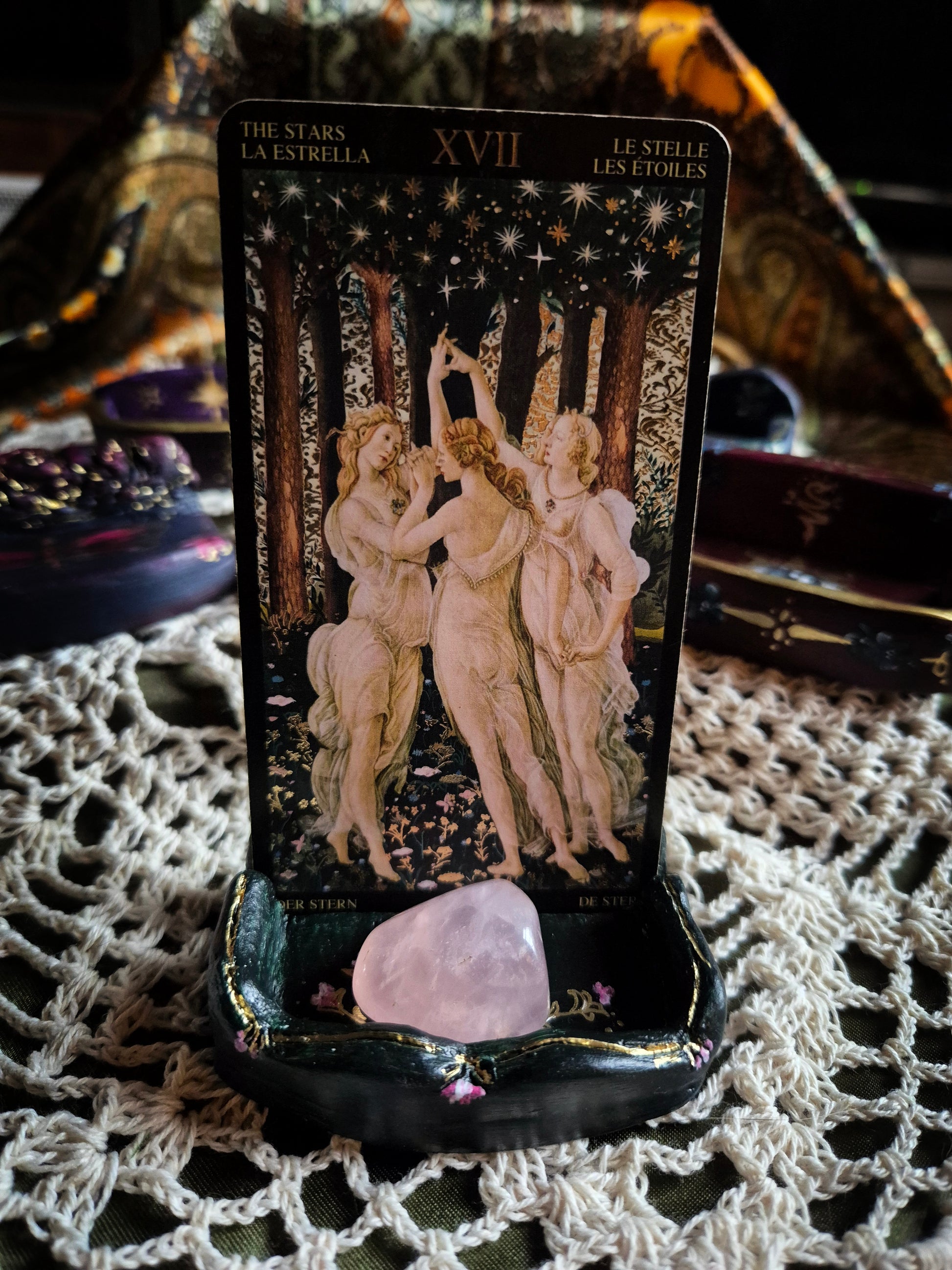 Give your tarot or oracle card a place of honor with this hand-painted Arcana Altar. Each piece is unique and has a special spot for a crystal, amulet, or other meaningful object. Perfect for amplifying your intentions and keeping your daily card in sight ♡