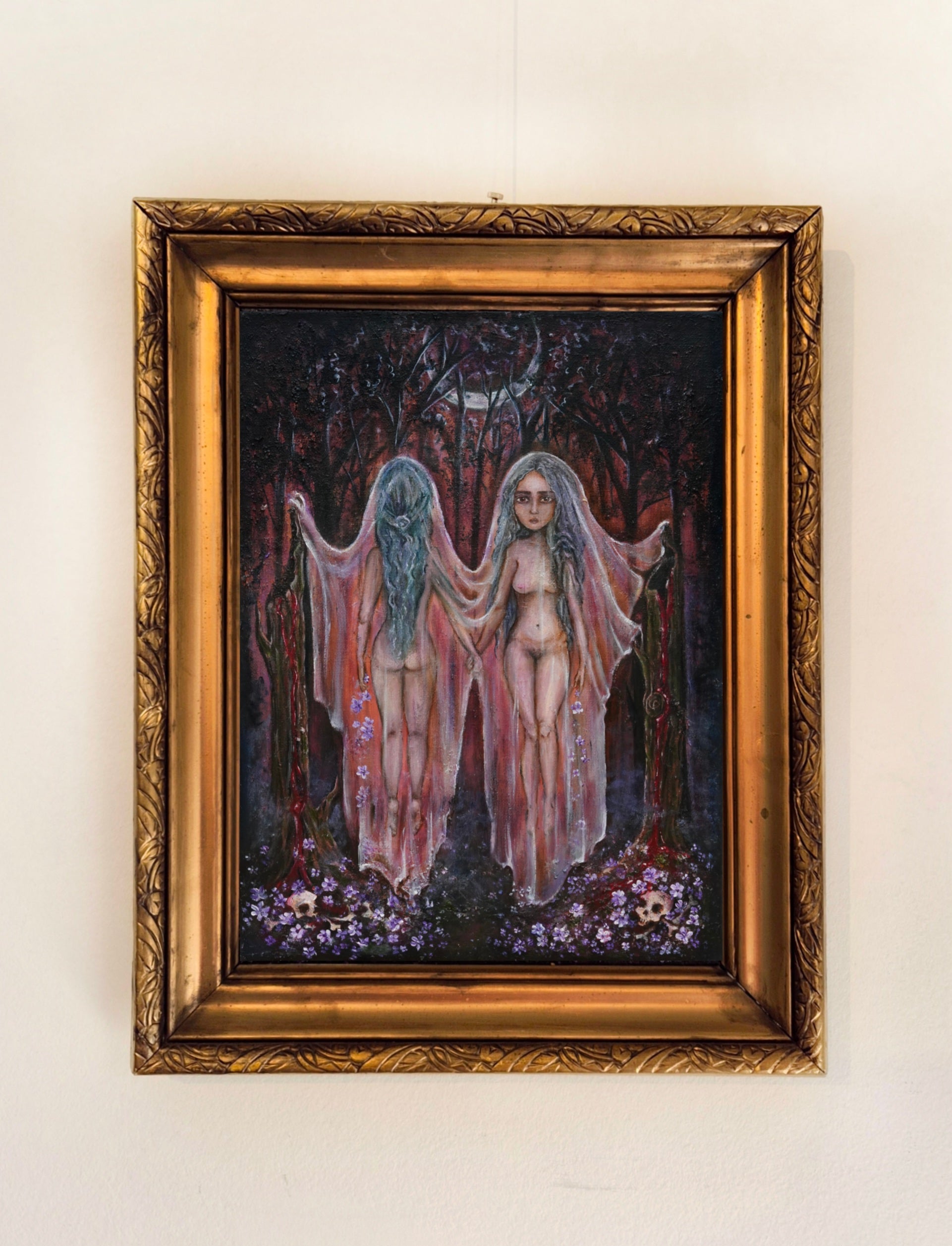 Two figures, mirror images yet not quite the same, drift through the liminal space of the forest. One looks forward, the other back - one facing the known, the other the unseen. They share the same veil, as if wrapped in the same story, the same fate. Bound together, yet separate, they hold hands—a tether between past and present, between what was and what might be.